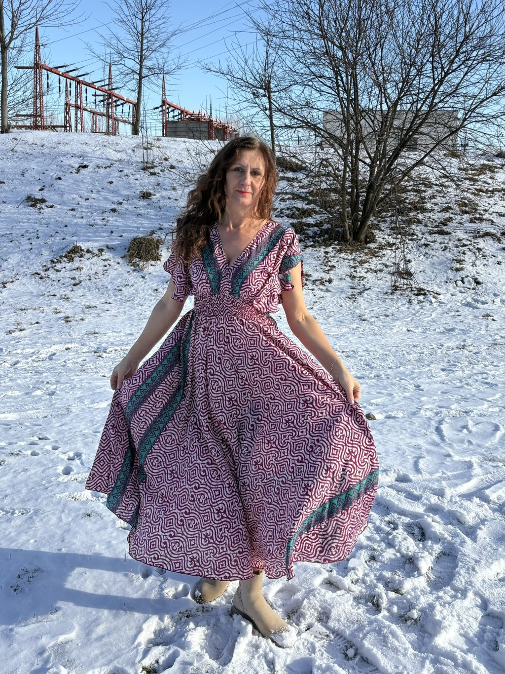 Každý kousek je vybrán s důrazem na detail a kvalitu. Naše oblečení je vyrobeno z vysoce kvalitního hedvábí, které zajišťuje nejen komfort, ale také luxusní vzhled a pocit. Díky lehkosti a jemnosti tohoto materiálu se šaty Taara skvěle nosí a dodávají vám elegantní styl, ať už je nosíte na speciální příležitosti, nebo si je obléknete na běžný den.