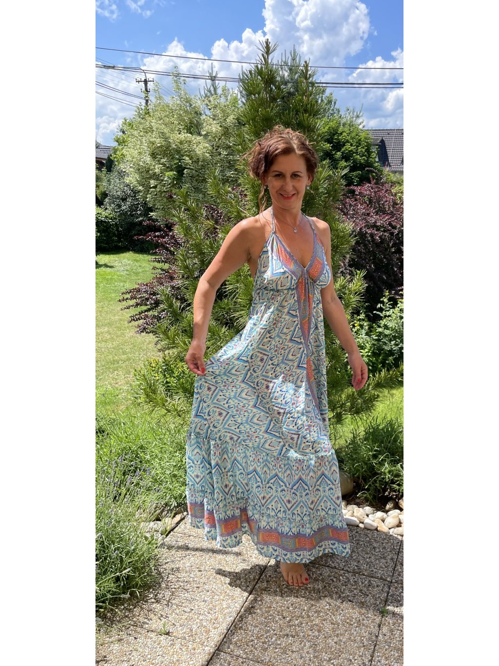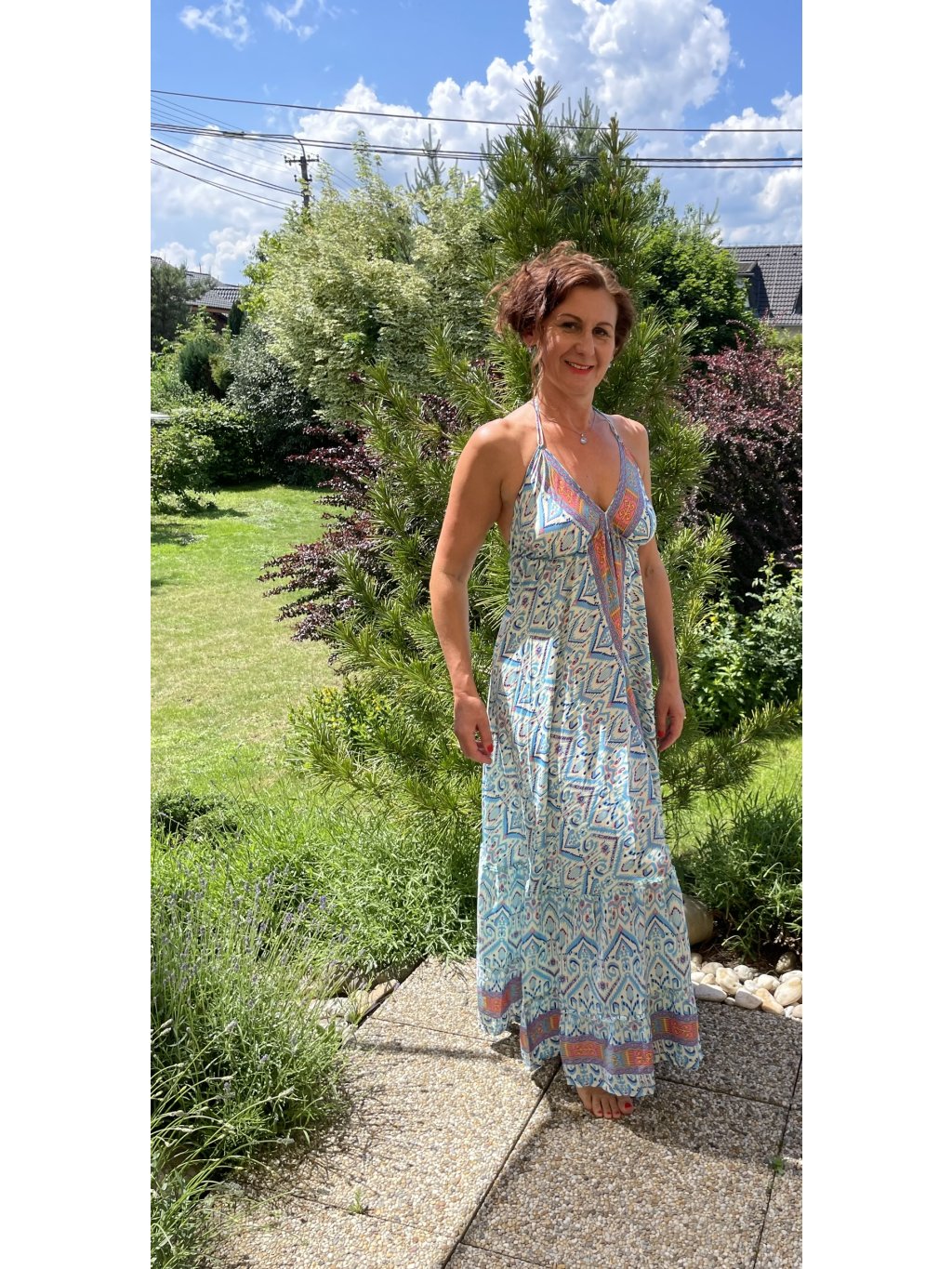 - Celková délka šatů: 124 cm + šňůrky na zavazování za krkem