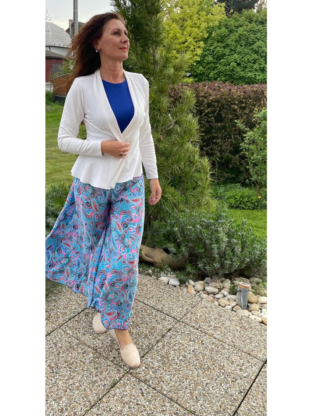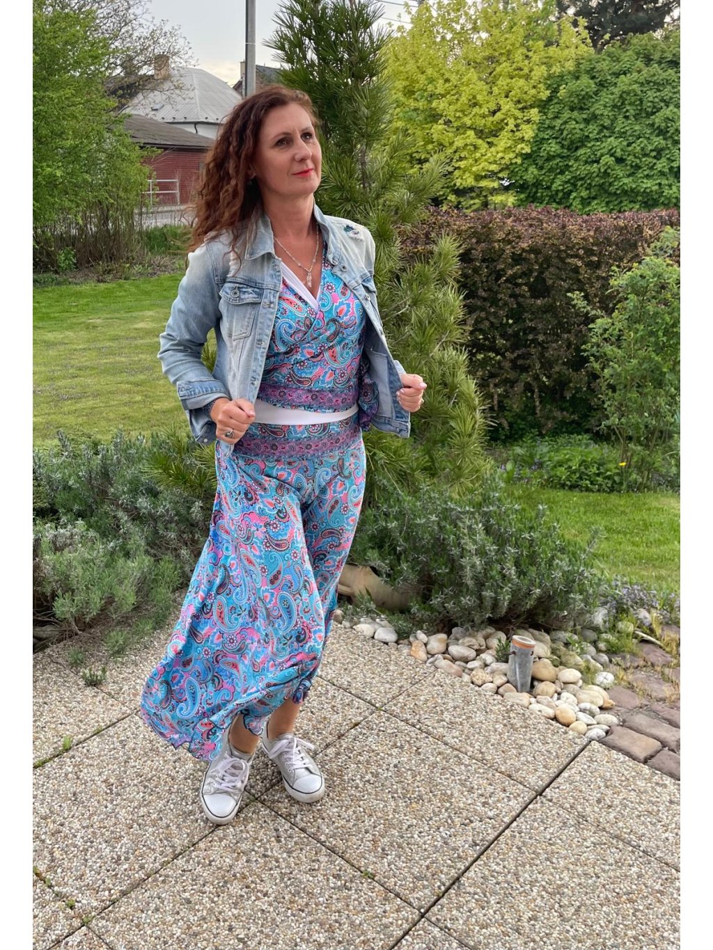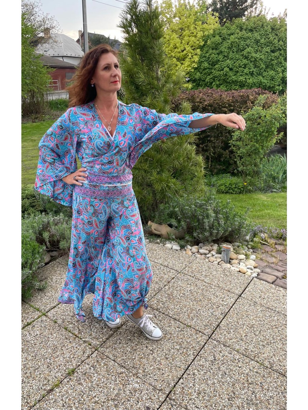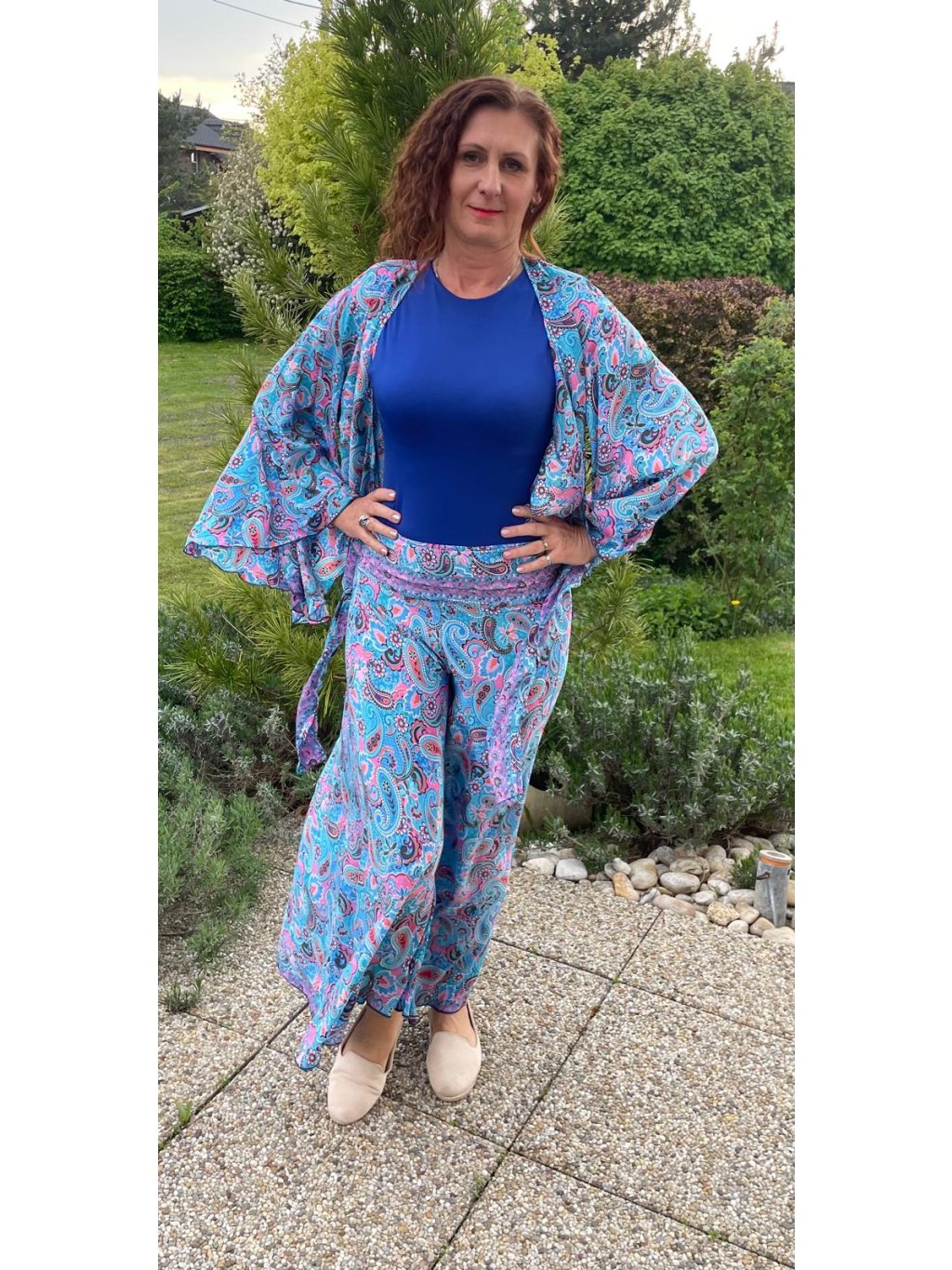 Set zahrnuje vzdušné letní kalhoty a halenku, které jsou vyrobeny z kvalitního hedvábí a mají zajímavé vzory spolu s nepravidelným okrajem na spodní části kalhot. V přední části kalhot se nachází hladký široký pás, který zdůrazňuje váš pas, zatímco zadní část je vybavena širokou gumou, která se skvěle přizpůsobí vaší postavě.