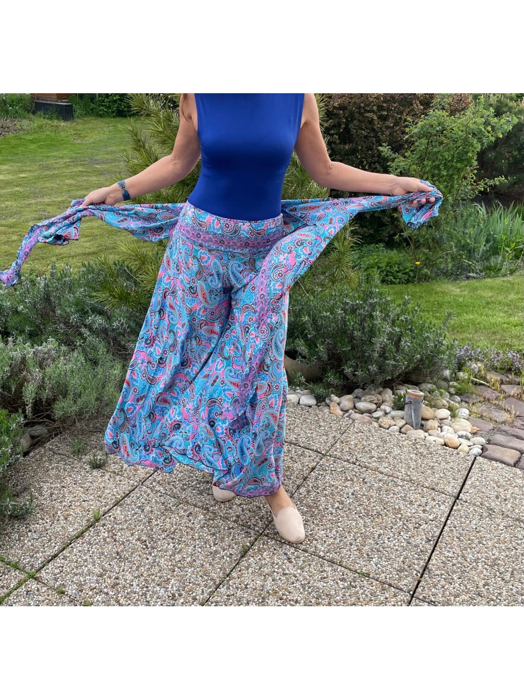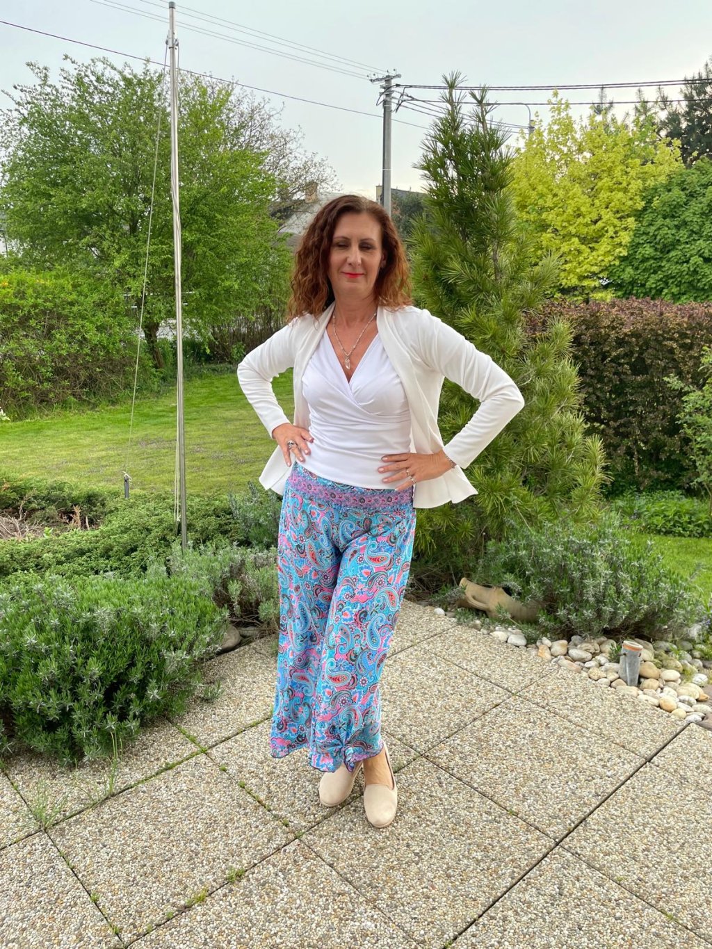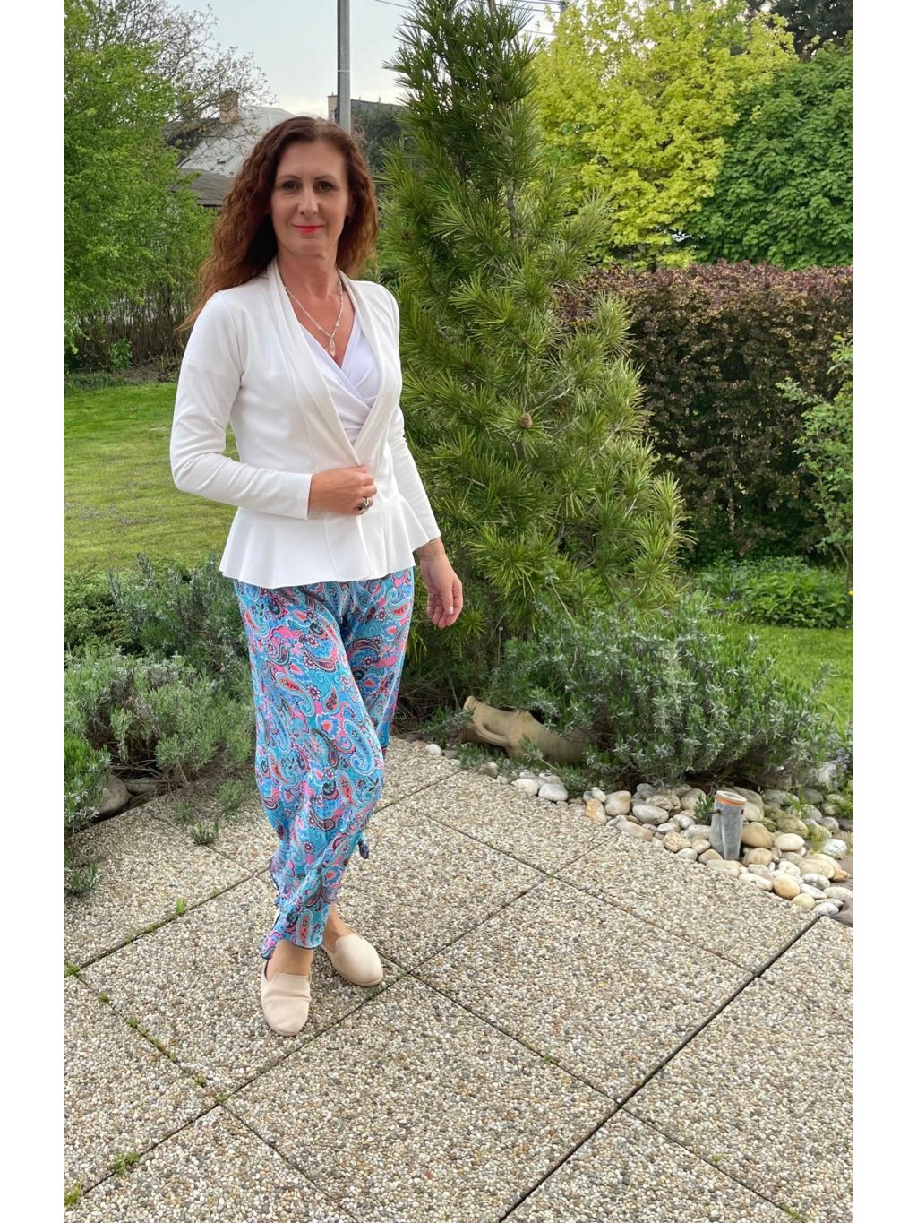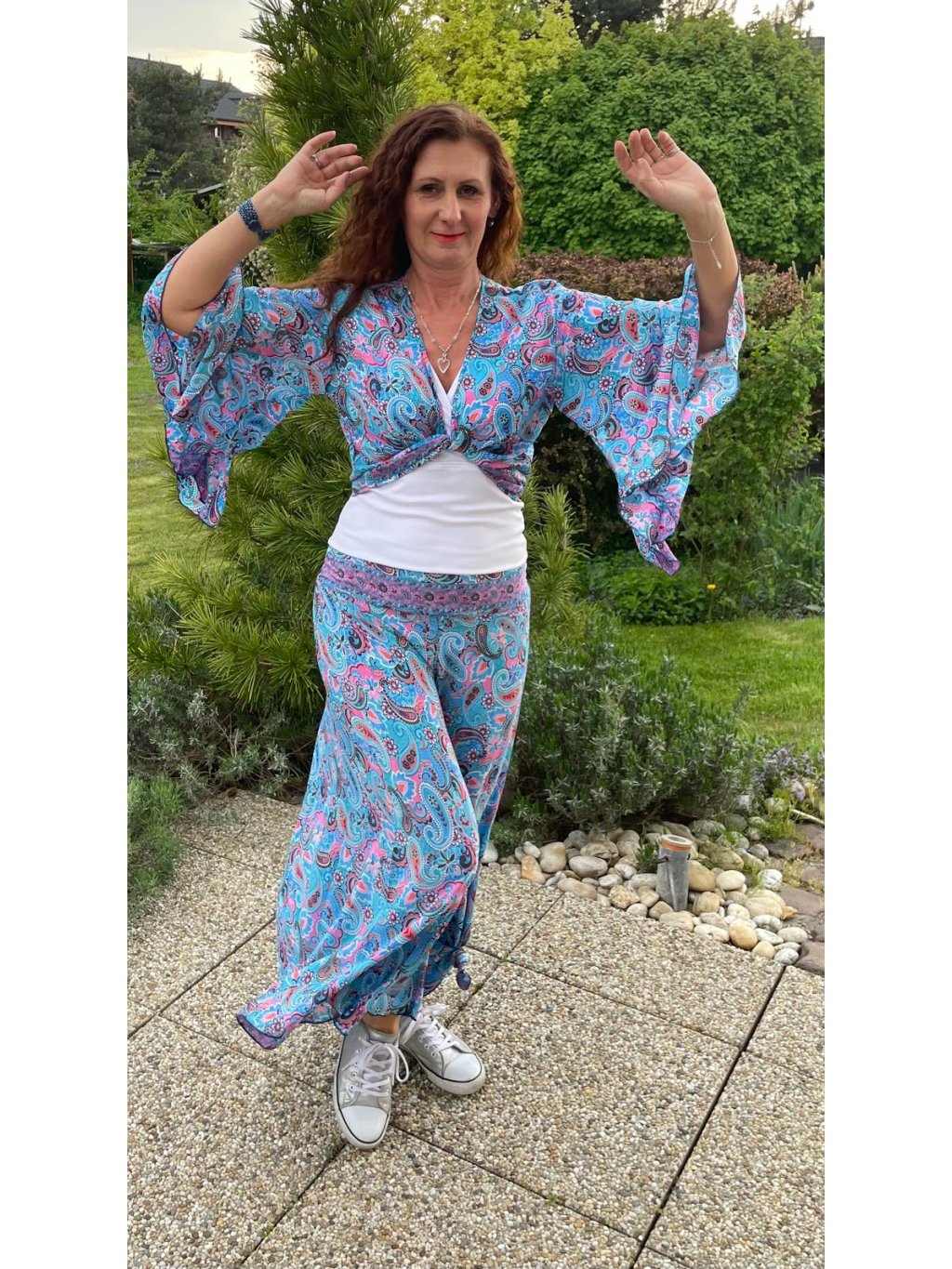 Set zahrnuje vzdušné letní kalhoty a halenku, které jsou vyrobeny z kvalitního hedvábí a mají zajímavé vzory spolu s nepravidelným okrajem na spodní části kalhot. V přední části kalhot se nachází hladký široký pás, který zdůrazňuje váš pas, zatímco zadní část je vybavena širokou gumou, která se skvěle přizpůsobí vaší postavě.