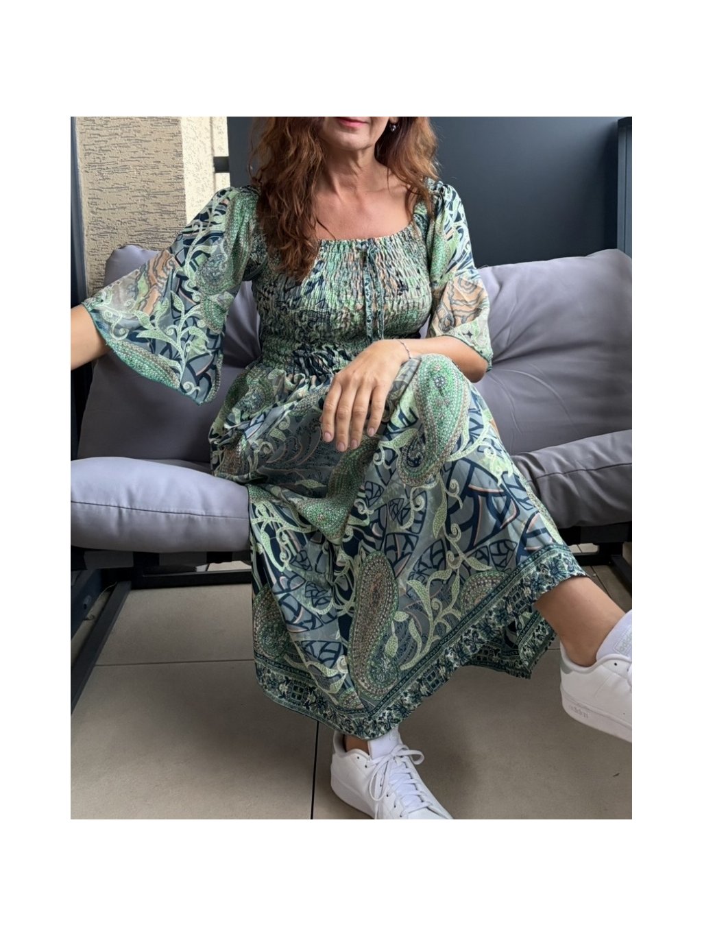 Elegantní zelené hedvábné šaty s řasením, které skvěle sedí na postavě díky propracovanému střihu a pružnosti v horní části, kde jsou všity gumičky. Tyto detaily zajišťují pohodlí a elegantní vzhled.