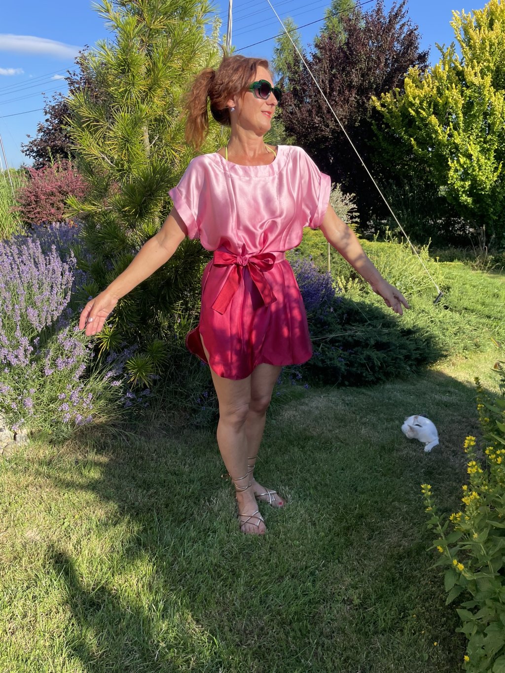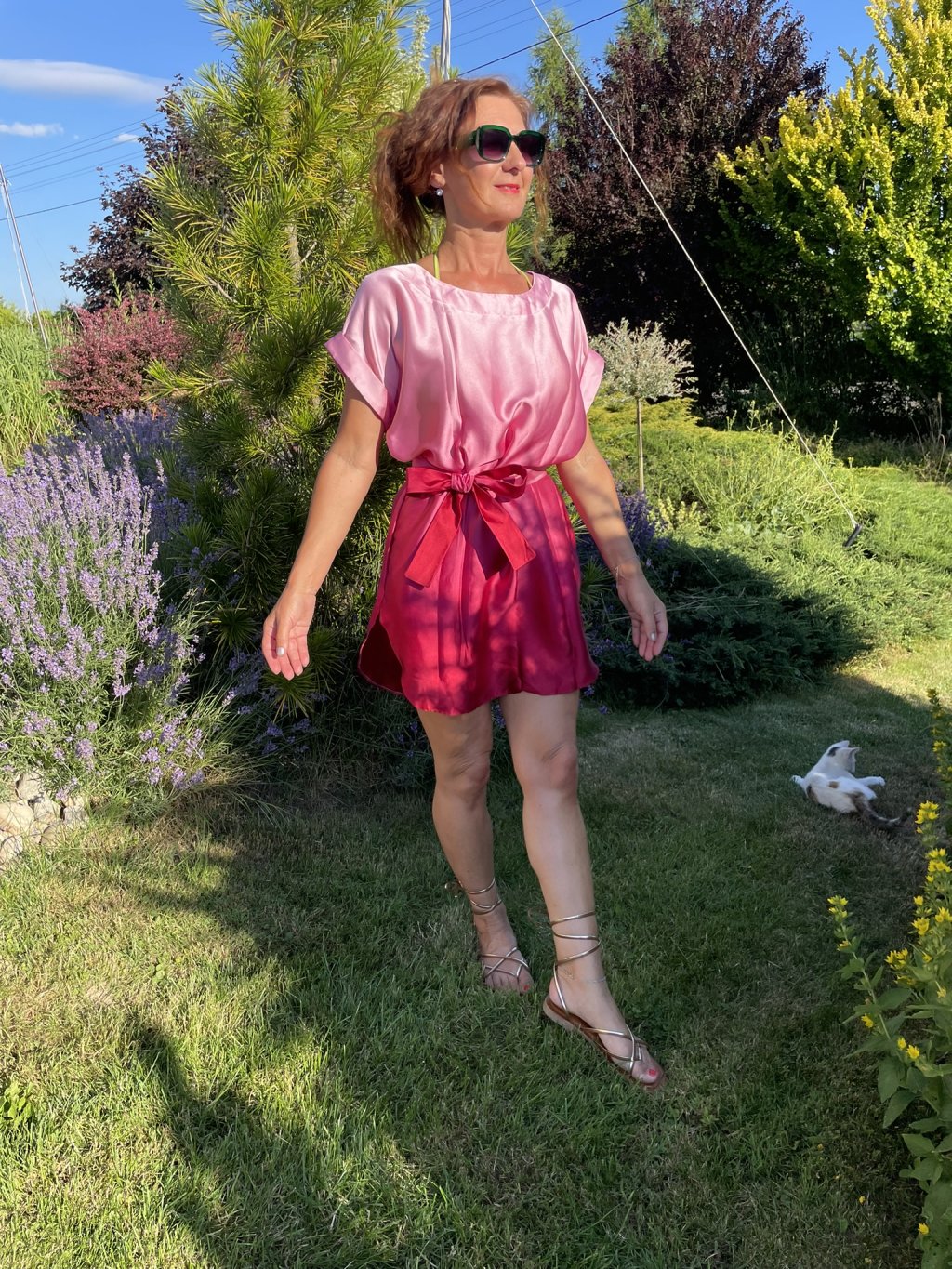 Tyto šaty nejsou jen krásné – mají svou vlastní cestu. Lehoučkou hedvábnou látku jsem osobně vybrala při cestách po Indii. Zamilovala jsem se do jejího jemného lesku a lehkosti na první dotek. Po návratu do Česka jsem látku svěřila šikovným rukám švadlenky, která je proměnila v jednoduché, ale výrazné šaty s duší. K šatům je ušitý také pásek, kterým si šaty můžete zavázat v pase.